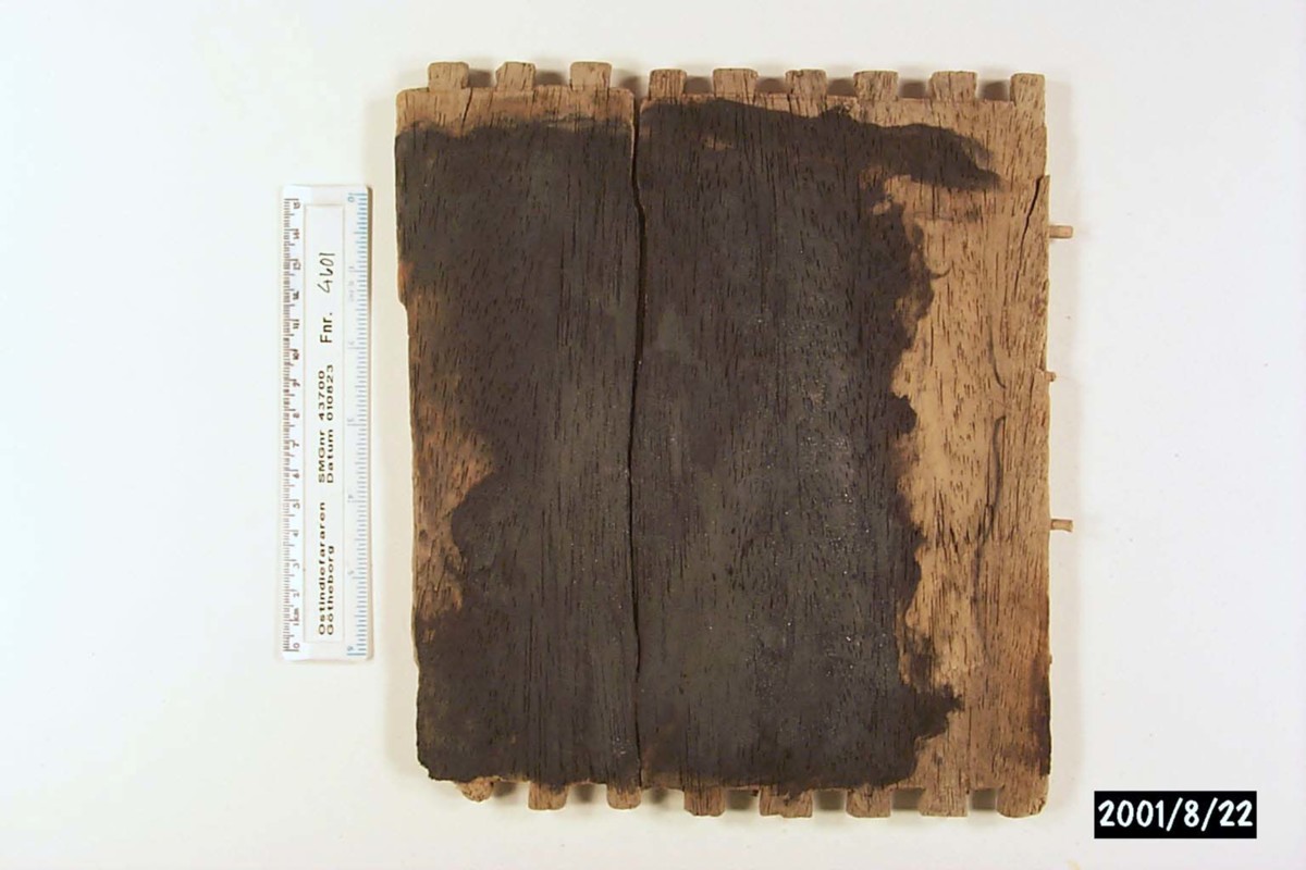 1) Mått enl. ovan. Sinkade kortsidor. Svartfärgad på ena sidan (insidan?), ytbehandling? Missfärgad av rost. Saltutfällningar, främst på den svarta färgen. Delvis angripet av skeppsmask.