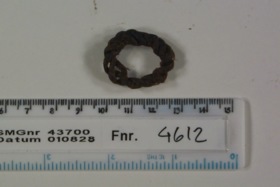 Lagd ring av treslaget garn, ena kardelen är avbruten på en bit av ringen.