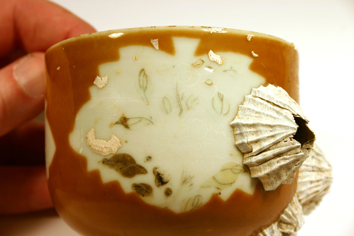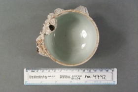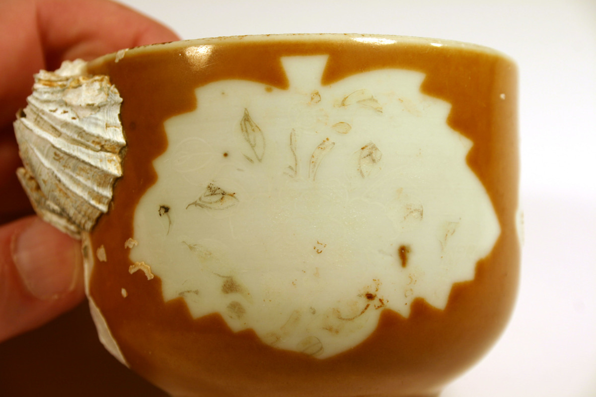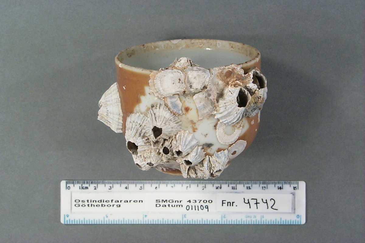 Föremålet kommer från lasten från vraket av ostindiefararen Götheborg, som gjorde tre resor till Kina 1739-45. Vid hemkomsten från den sista resan 12 september 1745 förliste fartyget vid grundet Hunnebådan strax utanför Nya Elfsborgs fästning. Vid flera tillfällen har material tagits upp från vraket. Föremålet kommer från de marinarkeologiska utgrävningarna på platsen 1986-1992.