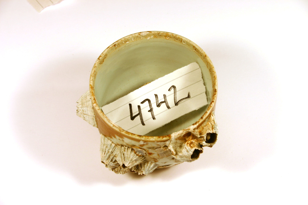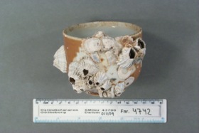 Cylindrisk burk. Kategori D; brun glasyr med tre ursparningar i form av löv, som dekorerats med emaljfärger. Emaljfärgerna är lösa och känsliga och har mestadels fallit av, de som är kvar är ljusgröna i färgen. Oglaserad i mynningskanten på insidan. Delvis täckt av havstulpaner.