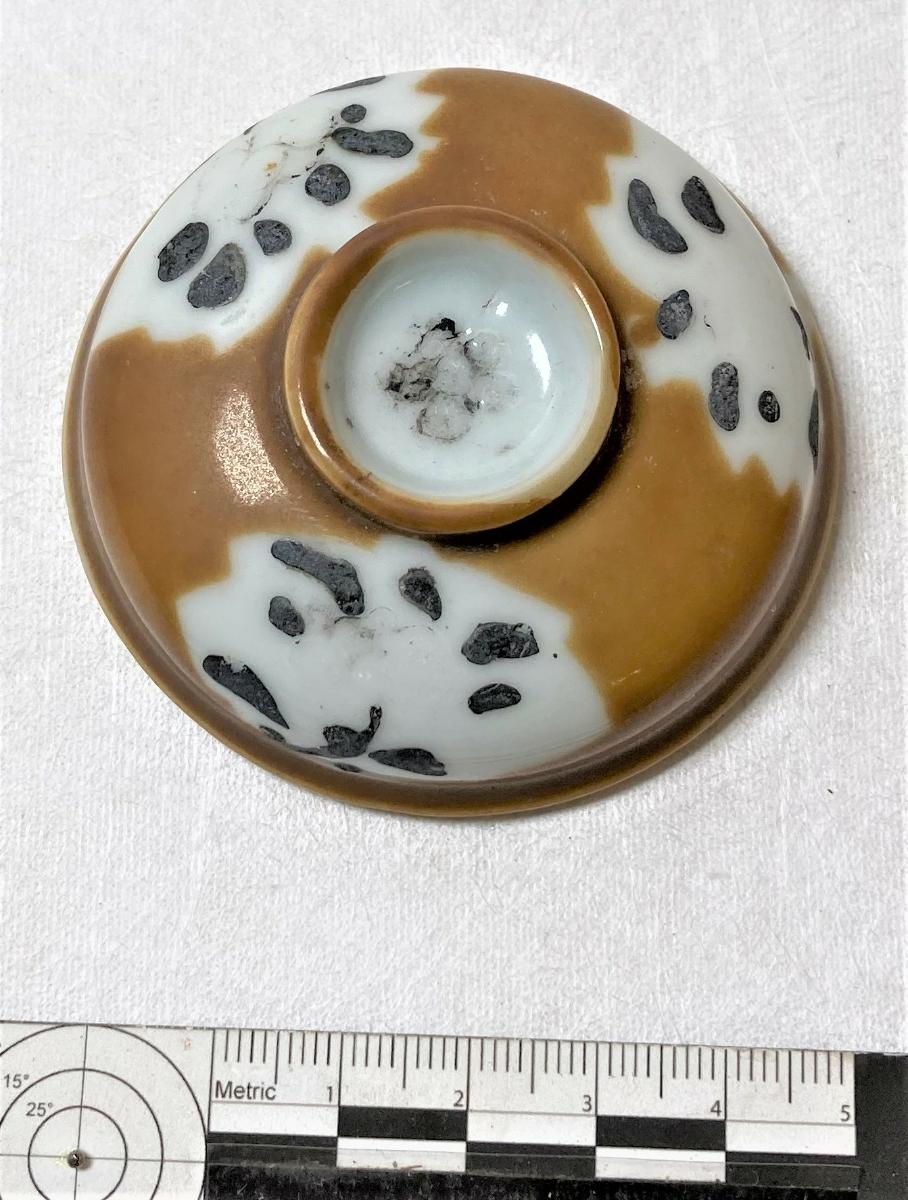 3 stl. lock till burkar. Välvt med skålformat "handtag" i mitten på ovansidan, oglaserad kant, på undersidan, för passning i burken. Kategori D; brun glasyr med tre ursparningar i form av löv, som dekorerats med emaljfärger. Emaljfärgerna är lösa och känsliga och har mestadels fallit av, de som är kvar är svarta i färgen.