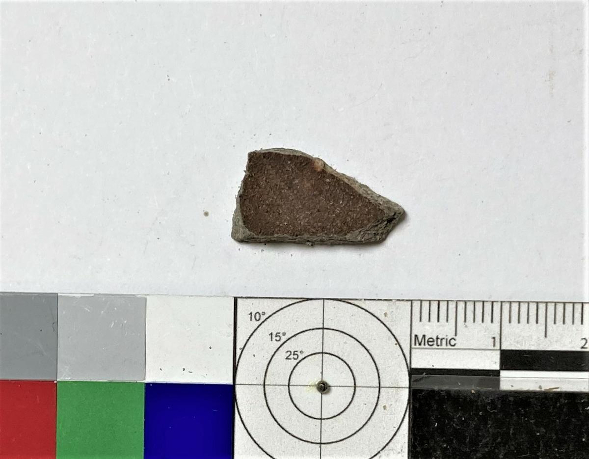 Skärva av kärl, grått gods, brun matt glasyr på insidan, mörkbrun blank på utsidan.