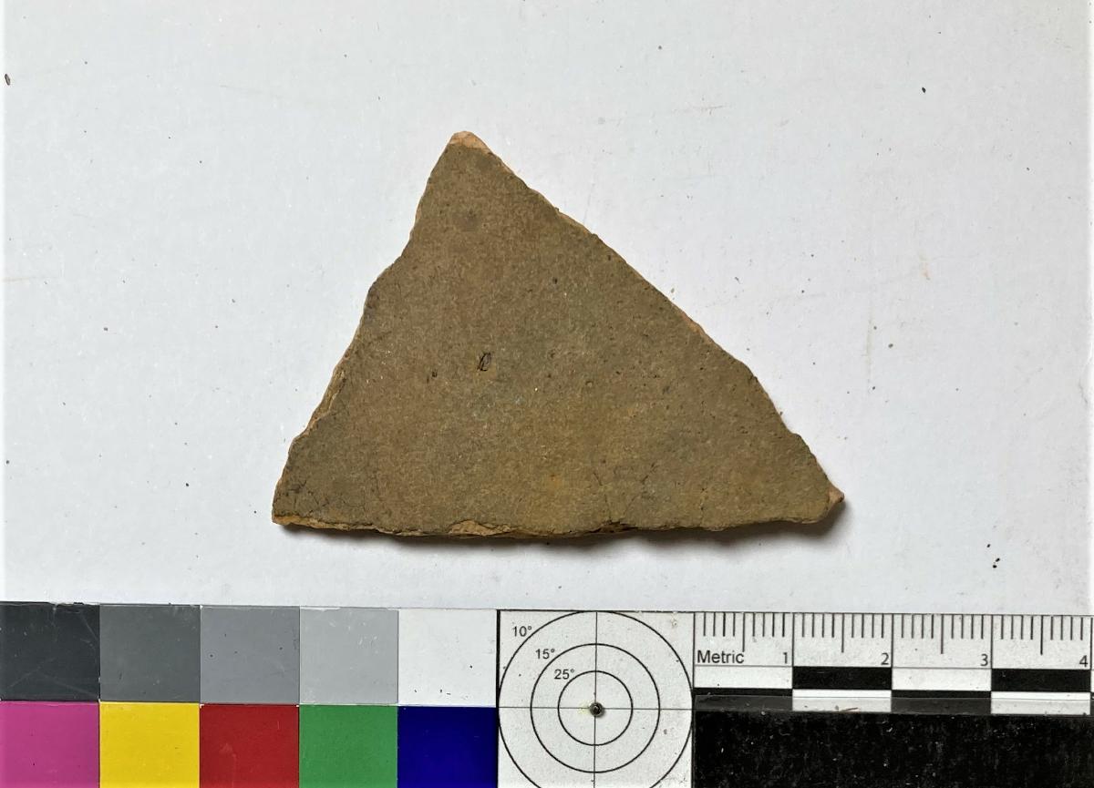 Skärva av kärl, lätt välvd, triangulär. Svarvad. Grågrön matt glasyr på utsidan.