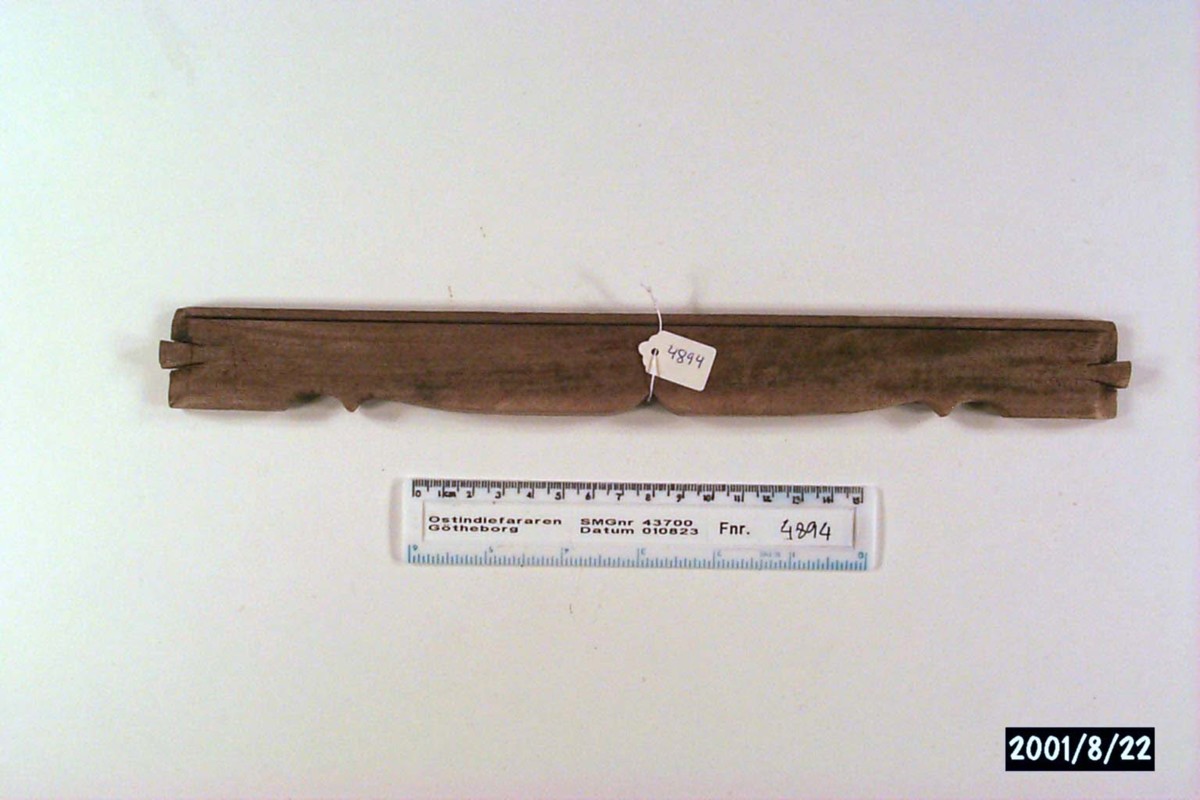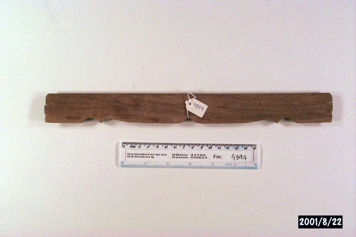 Föremålet är från vraket av ostindiefararen Götheborg, som gjorde tre resor till Kina 1739-45. Vid hemkomsten från den sista resan 12 september 1745 förliste fartyget vid grundet Hunnebådan strax utanför Nya Elfsborgs fästning. Vid flera tillfällen har material tagits upp från vraket. Föremålet kommer från de marinarkeologiska utgrävningarna på platsen 1986-1992.