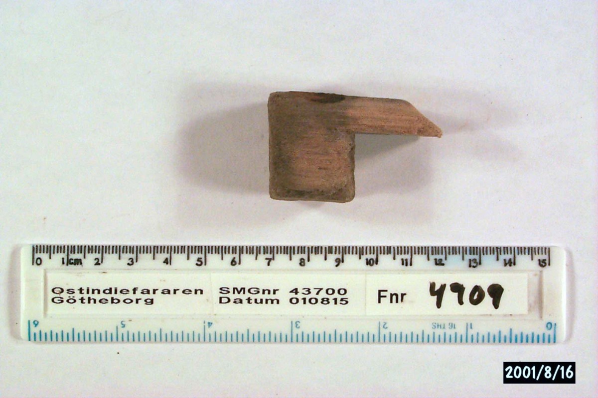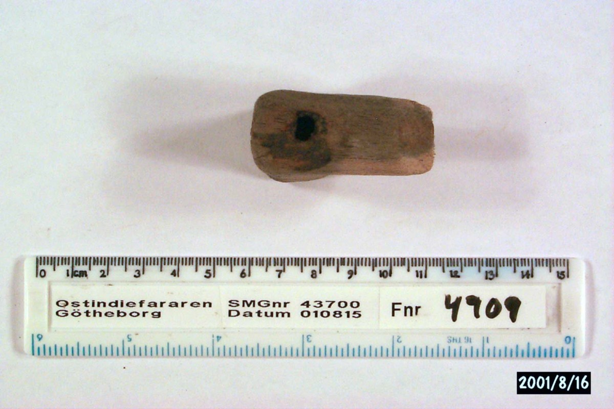 Föremålet är från vraket av ostindiefararen Götheborg, som gjorde tre resor till Kina 1739-45. Vid hemkomsten från den sista resan 12 september 1745 förliste fartyget vid grundet Hunnebådan strax utanför Nya Elfsborgs fästning. Vid flera tillfällen har material tagits upp från vraket. Föremålet kommer från de marinarkeologiska utgrävningarna på platsen 1986-1992.