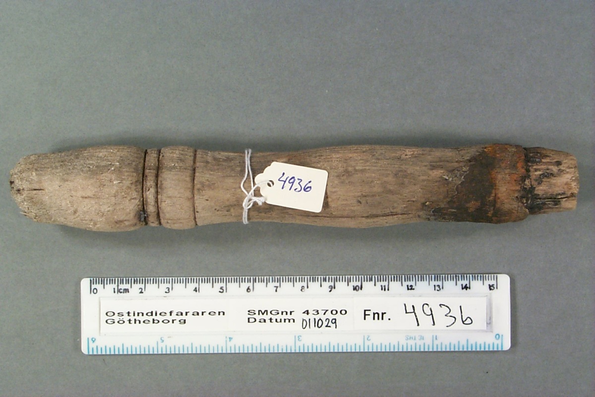 Föremålet är från vraket av ostindiefararen Götheborg, som gjorde tre resor till Kina 1739-45. Vid hemkomsten från den sista resan 12 september 1745 förliste fartyget vid grundet Hunnebådan strax utanför Nya Elfsborgs fästning. Vid flera tillfällen har material tagits upp från vraket. Föremålet kommer från de marinarkeologiska utgrävningarna på platsen 1986-1992.