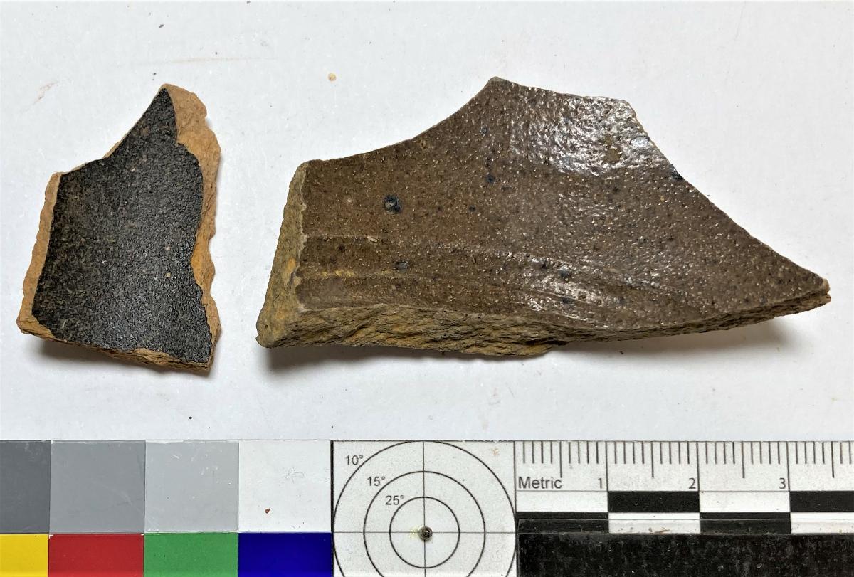 1) Skärva av kärl, del av botten eller kant. Beige gods, brun glasyr på insidan.