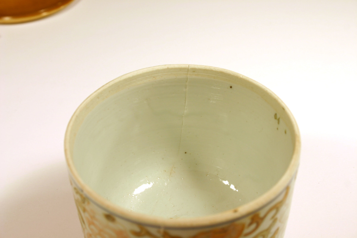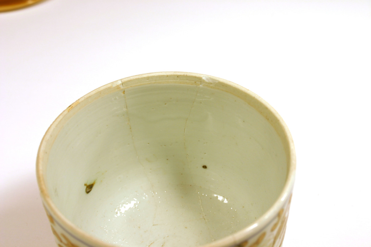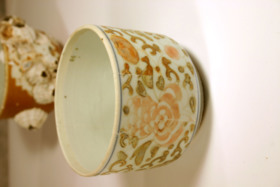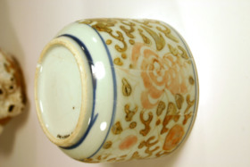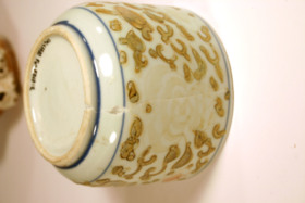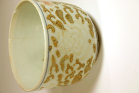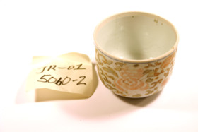 Kategori G; Skål, liten, vit med rester av rosa och grön överdekorglasyr. Den mesta har fallit bort. Ihopsatt av två större och en mindre bitar.