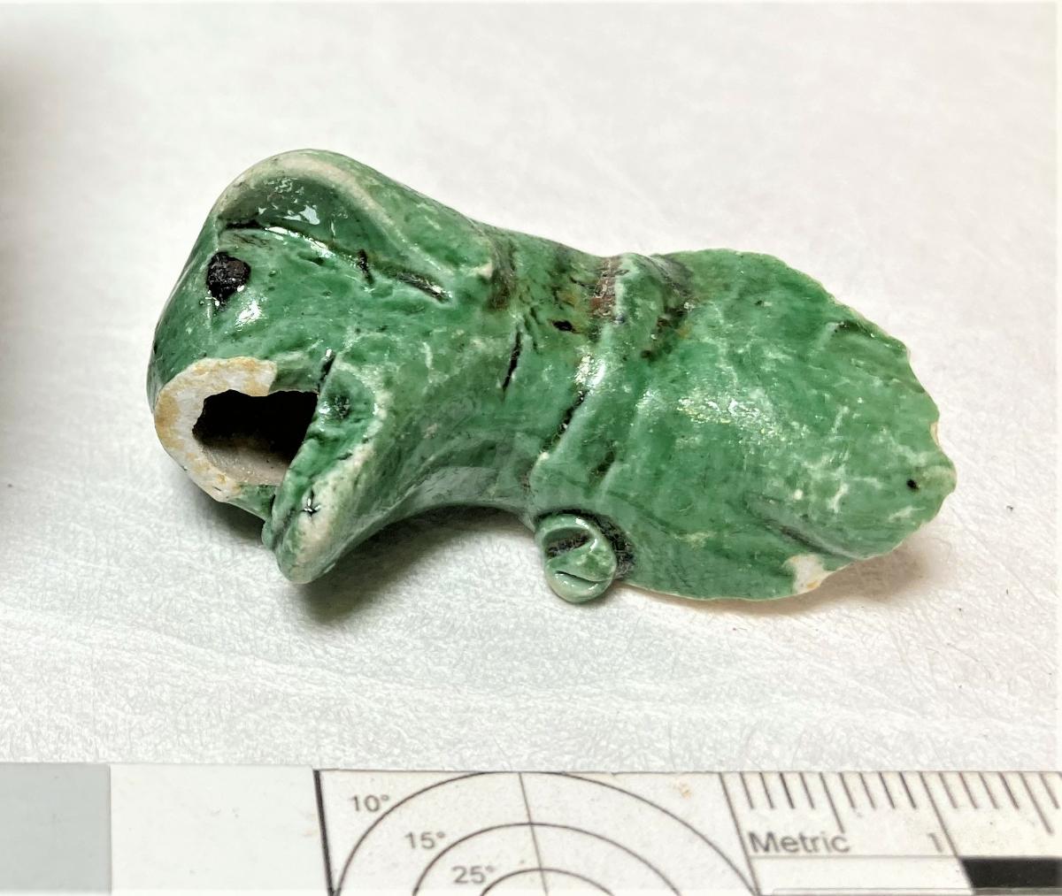 Hund i grön glasyr på ovansidan, oglaserad på undersidan, liggande, skarabé i ett band runt halsen. Endast huvud, avbruten vid halsen, nosen avbruten.