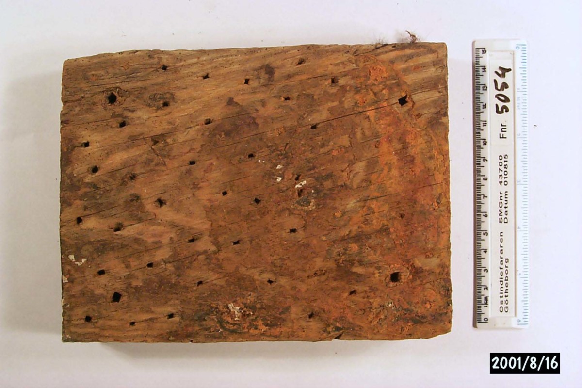 Fyrkantig, del av förhydring i tallträ. På ena sidan ett stort utskuret ovalt hål, som störst 63 mm, ca 20 mm djupt, två hål efter förhydringsspik i hålet. Fyra genomgående spikhål i hörnen på brädan, rester av drev. På andra sidan ett stort antal hål efter förhydringsspik. Rester efter korrosion och färg över hela föremålet.
