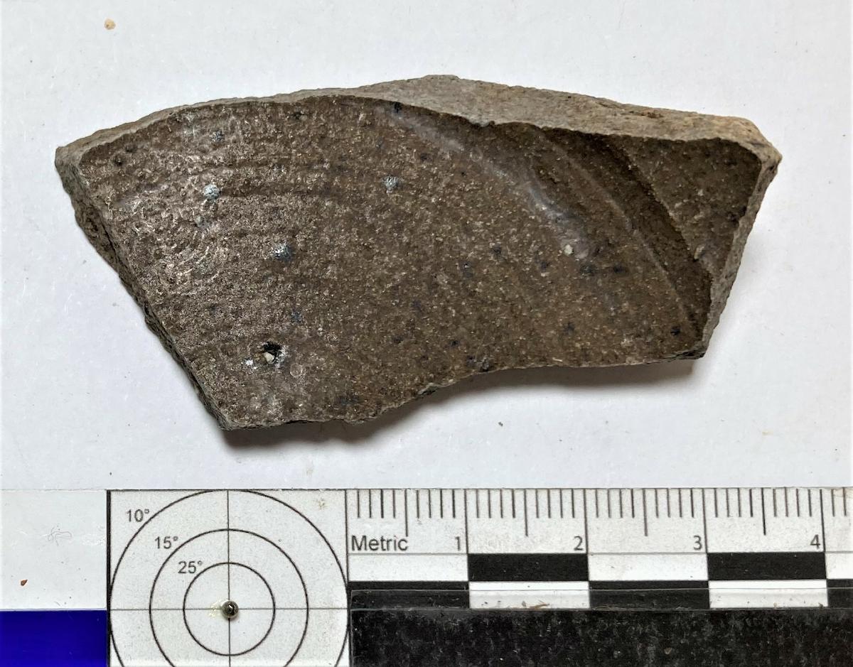 Kärl, del av botten, grått gods, brun glasyr på insidan.
