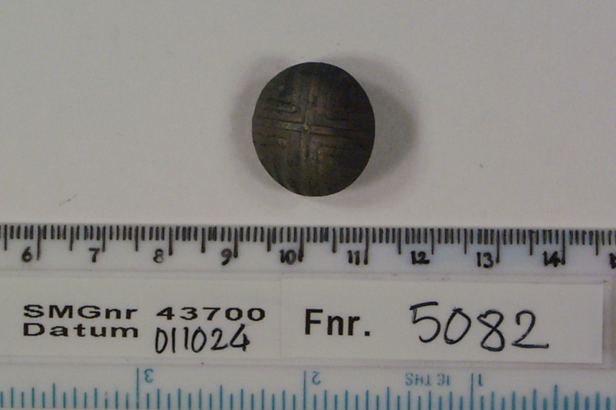 Knapp med ögla undertill för fastsättning. Kullrig översida med mönster av ett kors med vinkellinjer i kvadranterna.