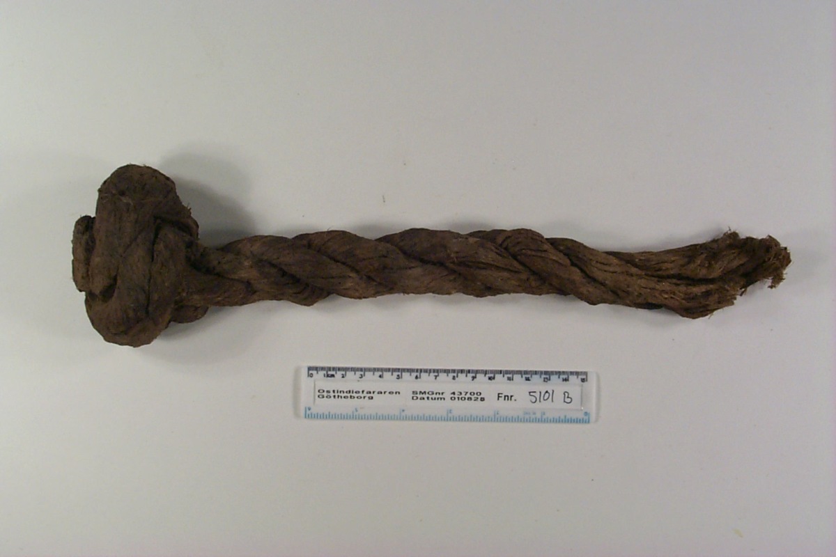 Dubbel taljerepsknop i ena änden av en avbruten tross. Treslagen tross; diameter: 32 mm. Tagling i änden under knopen av tvåtrådigt tjärat segelgarn.