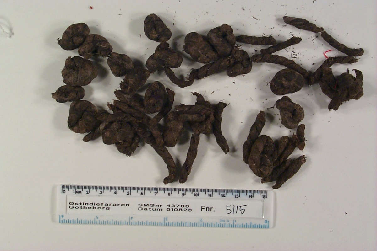 Ett stort antal små knopar, har sannolikt varit ihopfogade till ett nät eller liknande. Tillverkade av 4 mm tvåslagen lina.