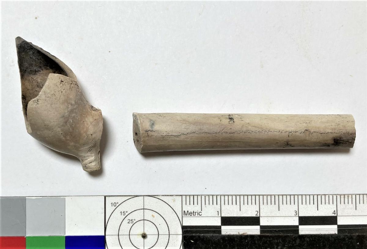 Skaft, avbrutet i båda ändar, passar samman med huvudet l:57 mm, d: 9-10 mm.
