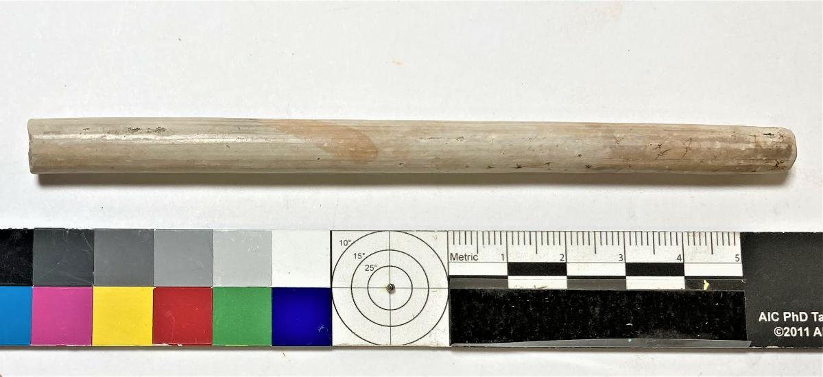 Avbrutet i båda ändar, ingen dekor. Tuggat/nött i ena änden, munstycke saknas - sannolikt avbrutet.