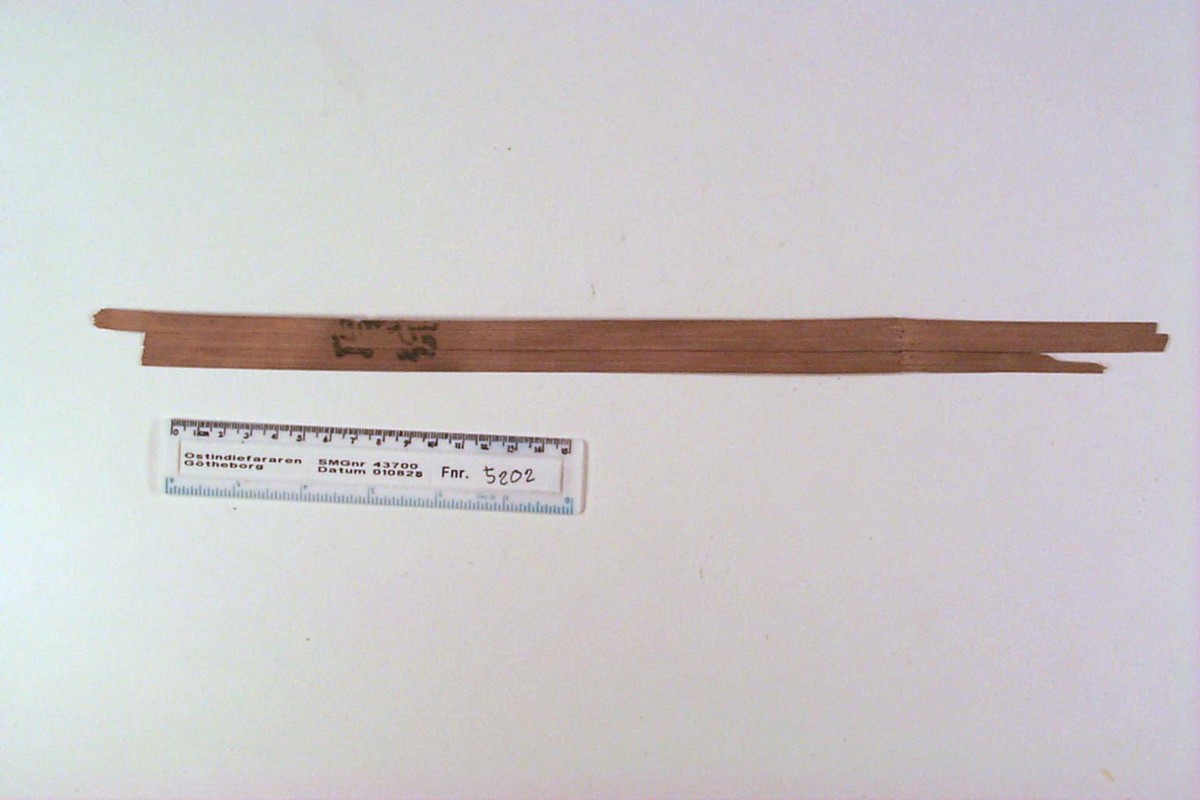 Föremålet är från vraket av ostindiefararen Götheborg, som gjorde tre resor till Kina 1739-45. Vid hemkomsten från den sista resan 12 september 1745 förliste fartyget vid grundet Hunnebådan strax utanför Nya Elfsborgs fästning. Vid flera tillfällen har material tagits upp från vraket. Föremålet kommer från de marinarkeologiska utgrävningarna på platsen 1986-1992.