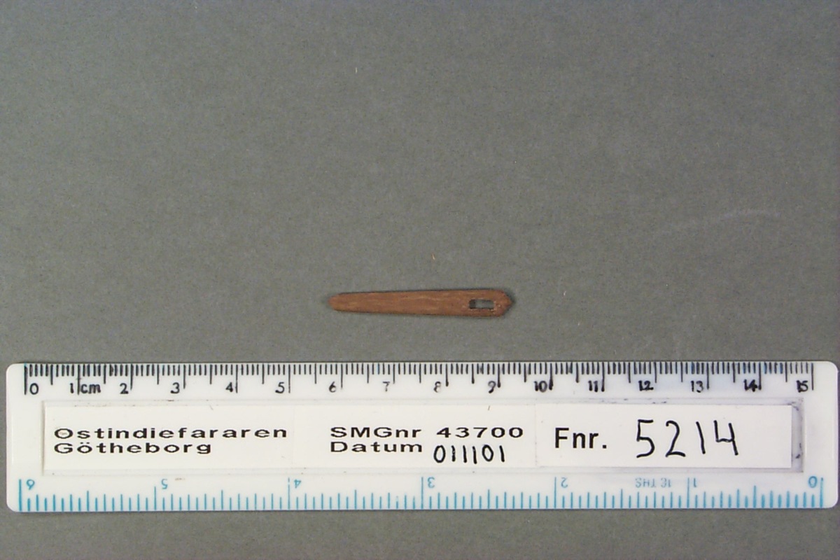 Föremålet är från vraket av ostindiefararen Götheborg, som gjorde tre resor till Kina 1739-45. Vid hemkomsten från den sista resan 12 september 1745 förliste fartyget vid grundet Hunnebådan strax utanför Nya Elfsborgs fästning. Vid flera tillfällen har material tagits upp från vraket. Föremålet kommer från de marinarkeologiska utgrävningarna på platsen 1986-1992.