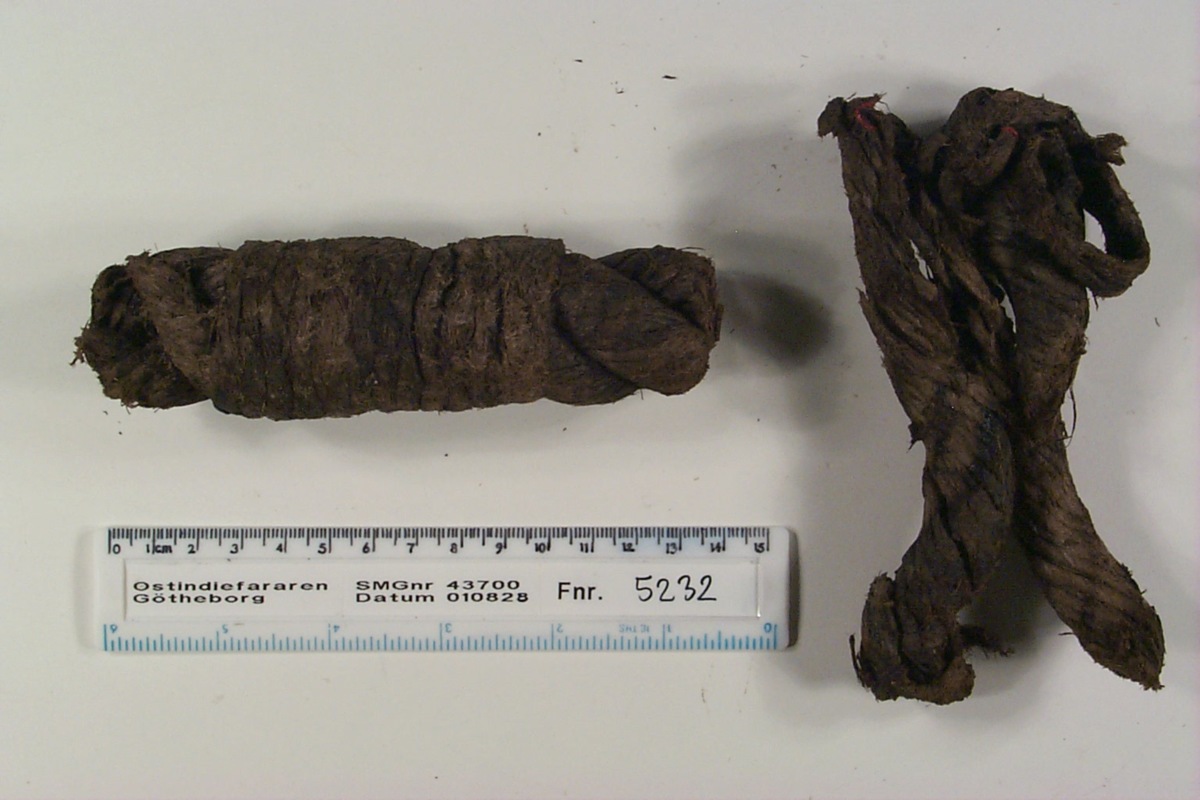 Två delar av tross, den ena är en bit av 34 mm tross, delvis klädd med 3 mm tvåslaget sjömansgarn. Den andra troligen från samma tross men helt uppslagen och trasig.