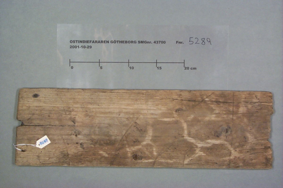 Föremålet är från vraket av ostindiefararen Götheborg, som gjorde tre resor till Kina 1739-45. Vid hemkomsten från den sista resan 12 september 1745 förliste fartyget vid grundet Hunnebådan strax utanför Nya Elfsborgs fästning. Vid flera tillfällen har material tagits upp från vraket. Föremålet kommer från de marinarkeologiska utgrävningarna på platsen 1986-1992.