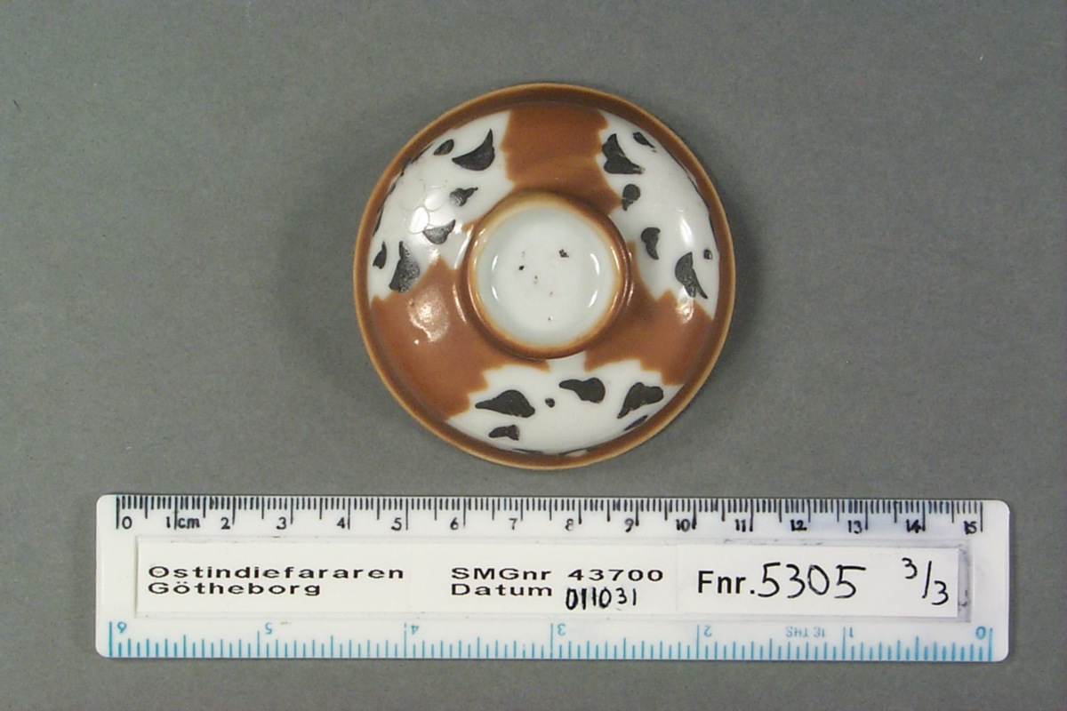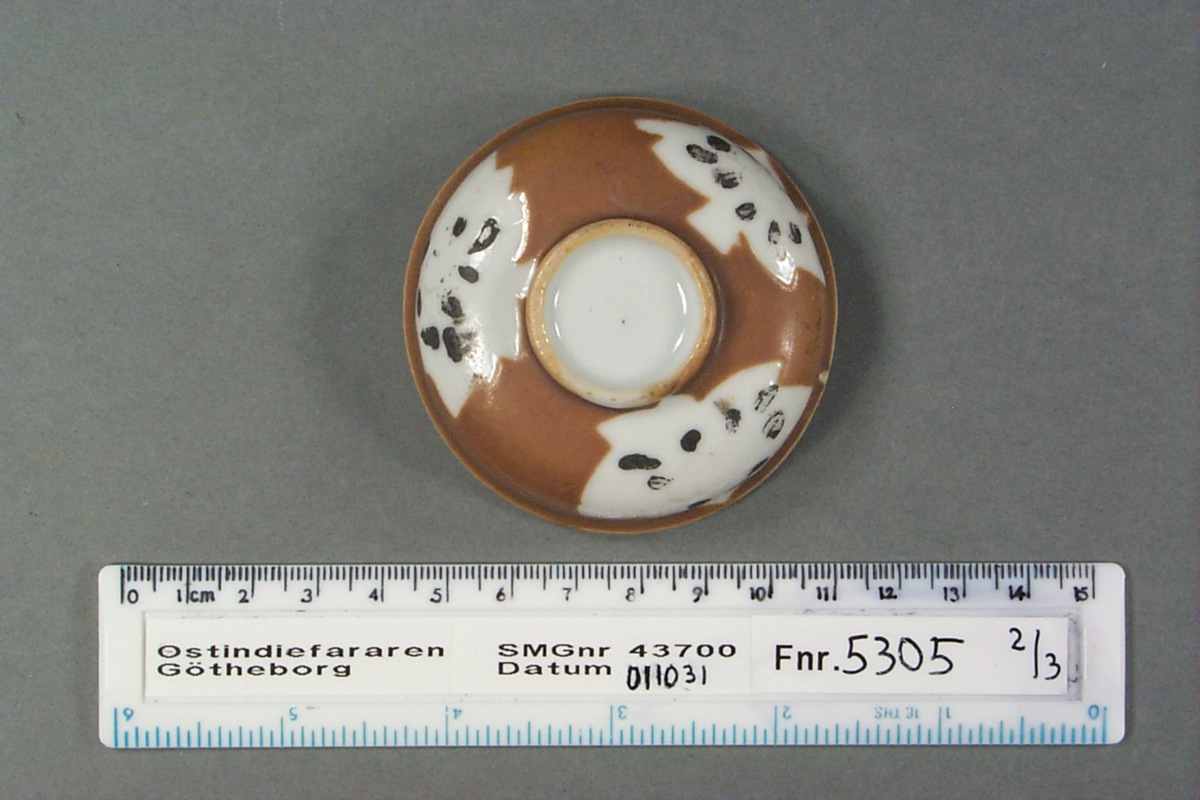2, 3) Kategori D; brun glasyr med tre ursparningar i form av löv, som dekorerats med emaljfärger. Emaljfärgerna är lösa och känsliga och har mestadels fallit av, de som är kvar är svarta i färgen.