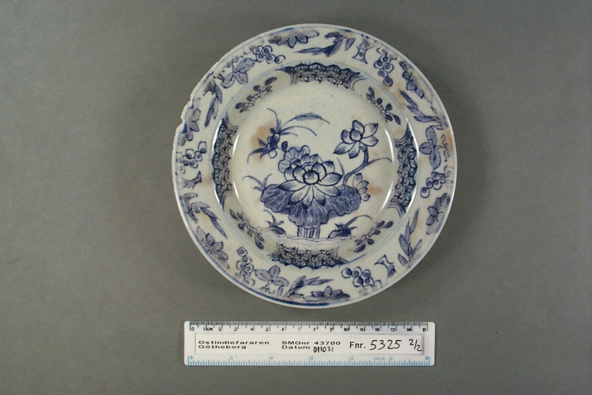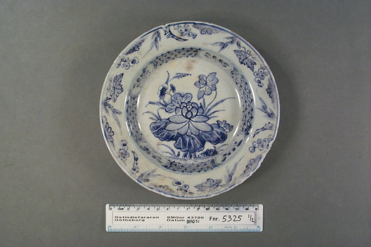 Kategori A; Underglasyrblå dekor; motiv: Mittmotivet lotusblommor, i kälningen en stjärnbård med blomreserver och runt brättet vindruvor och bambu. Kvistrankor på brättets baksida.