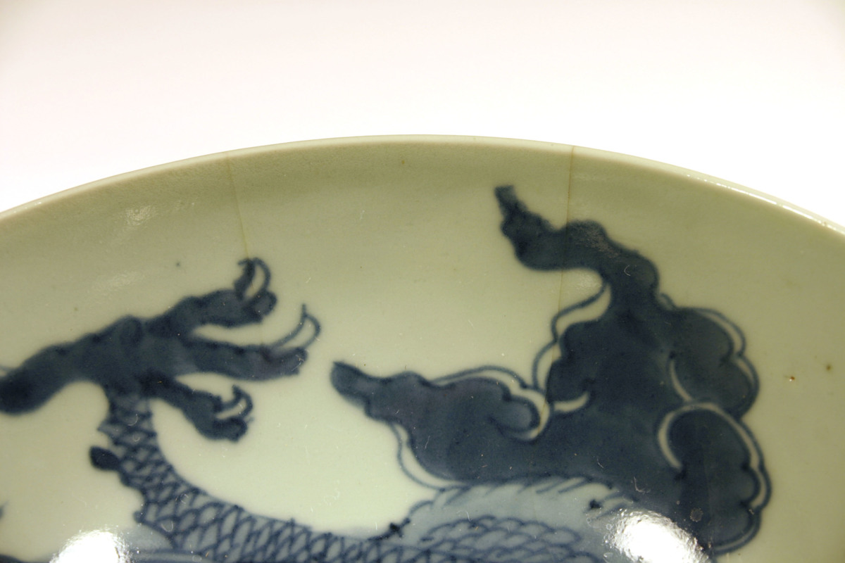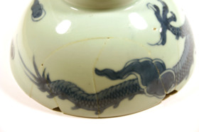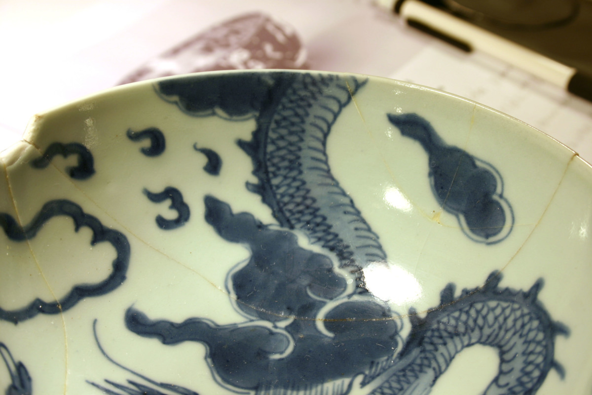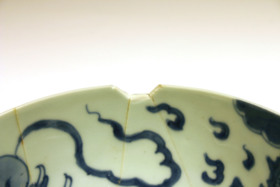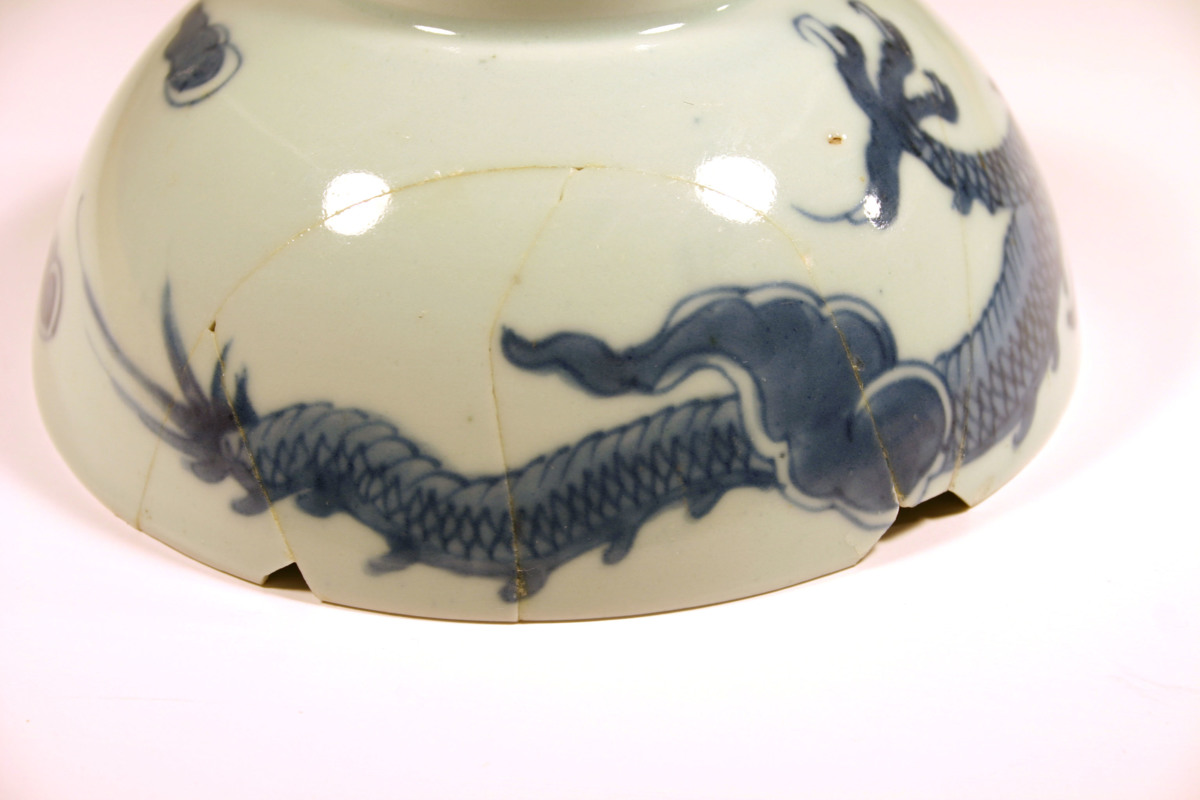 Ur mynningskanten saknas en bit 20 mm bred och 6 mm hög samt en trekantig bit 9 mm hög och 5 mm bred. Från den första och omslutande den andra är tre bitar inlimmade tillsammans 110 mm brett och 53 mm högt. I fogen vid skålens kurviga och i en trevägsskarv saknas en liten trekantig bit.