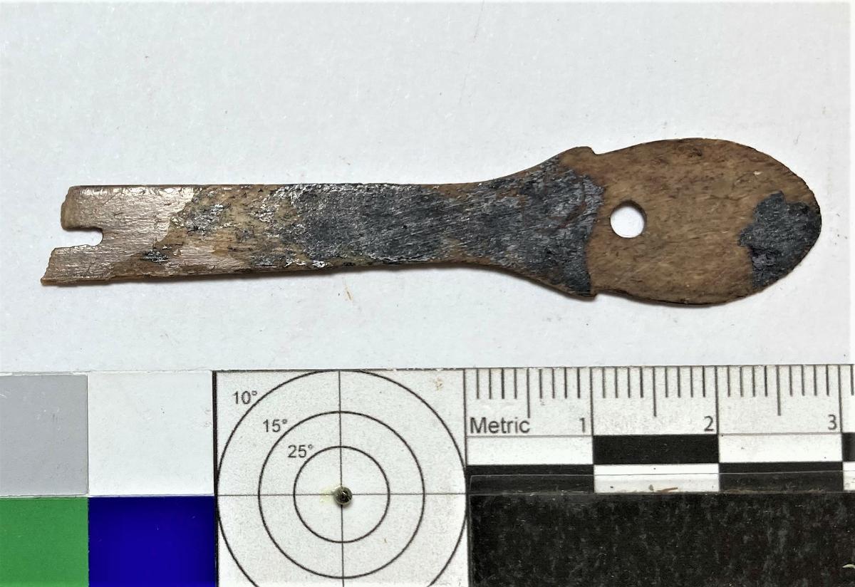 Spröt, del av, basen och en bit upp på skaftet, genomgående hål 11 mm från basen, spår av sågning.
