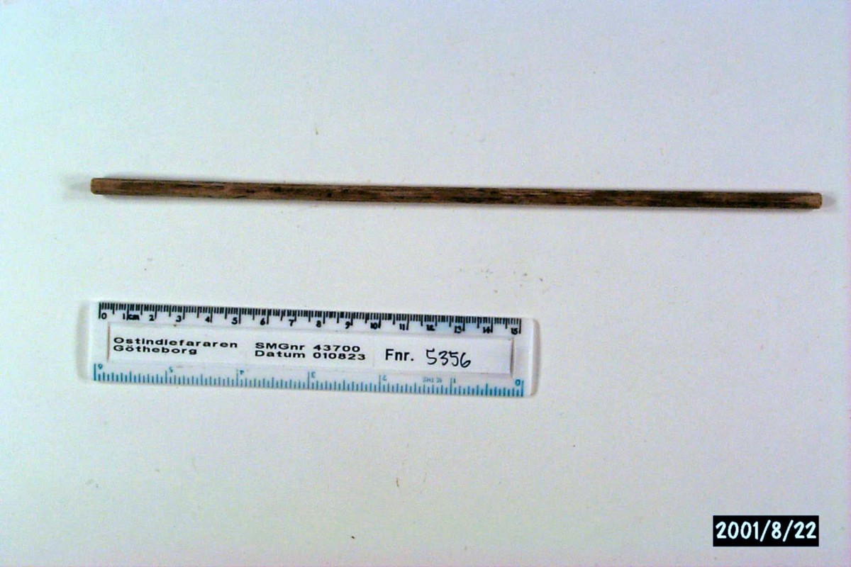 Föremålet är från vraket av ostindiefararen Götheborg, som gjorde tre resor till Kina 1739-45. Vid hemkomsten från den sista resan 12 september 1745 förliste fartyget vid grundet Hunnebådan strax utanför Nya Elfsborgs fästning. Vid flera tillfällen har material tagits upp från vraket. Föremålet kommer från de marinarkeologiska utgrävningarna på platsen 1986-1992.