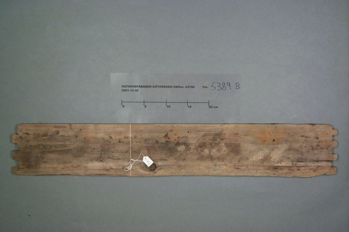 Föremålet är från vraket av ostindiefararen Götheborg, som gjorde tre resor till Kina 1739-45. Vid hemkomsten från den sista resan 12 september 1745 förliste fartyget vid grundet Hunnebådan strax utanför Nya Elfsborgs fästning. Vid flera tillfällen har material tagits upp från vraket. Föremålet kommer från de marinarkeologiska utgrävningarna på platsen 1986-1992.