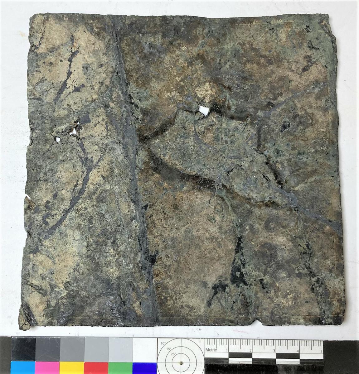 Kvadratisk blyplatta, fina skåror längs kanterna. Kalkbeläggning.