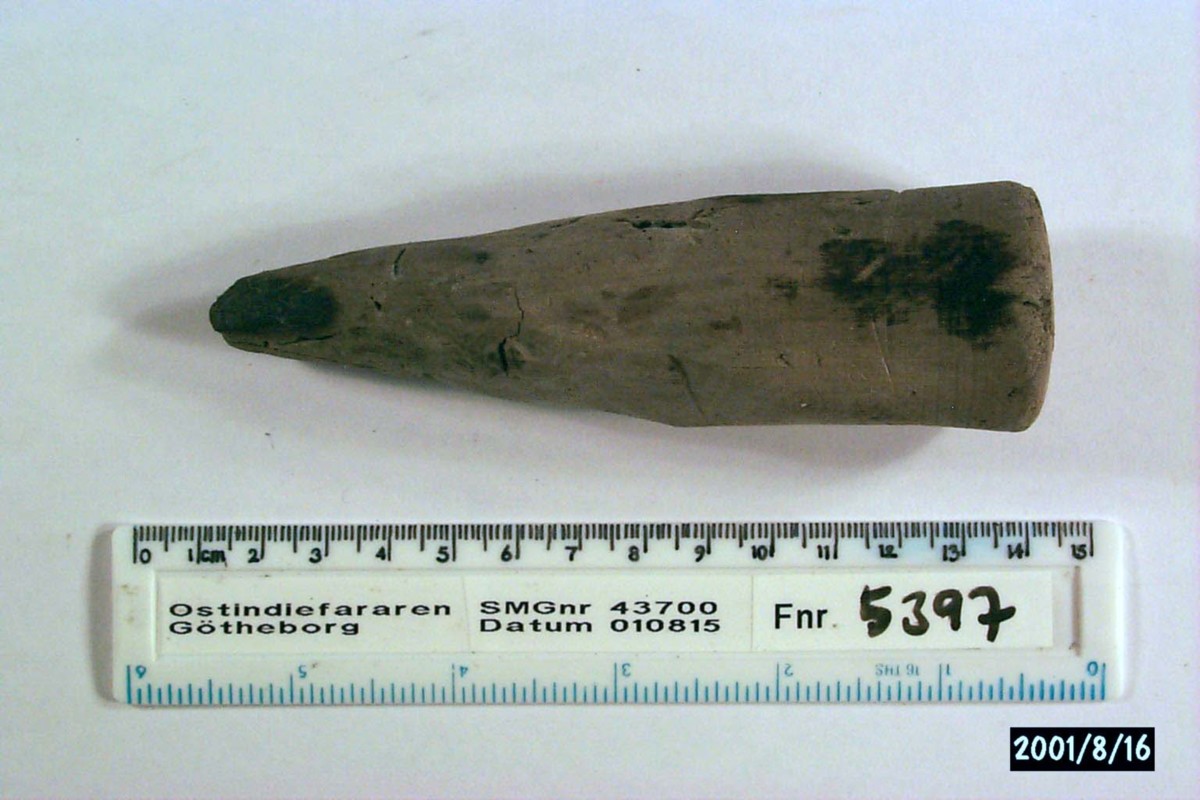 Föremålet är från vraket av ostindiefararen Götheborg, som gjorde tre resor till Kina 1739-45. Vid hemkomsten från den sista resan 12 september 1745 förliste fartyget vid grundet Hunnebådan strax utanför Nya Elfsborgs fästning. Vid flera tillfällen har material tagits upp från vraket. Föremålet kommer från de marinarkeologiska utgrävningarna på platsen 1986-1992.