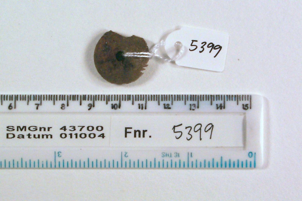 Knappform; cirkulär, lätt kullrig på ena sidan, flat på andra sidan, genomgående hål i mitten. Avbruten i ena kanten, eroderad, nedbruten. Spår av järnkorrosion. Tillverkad av lövträ.