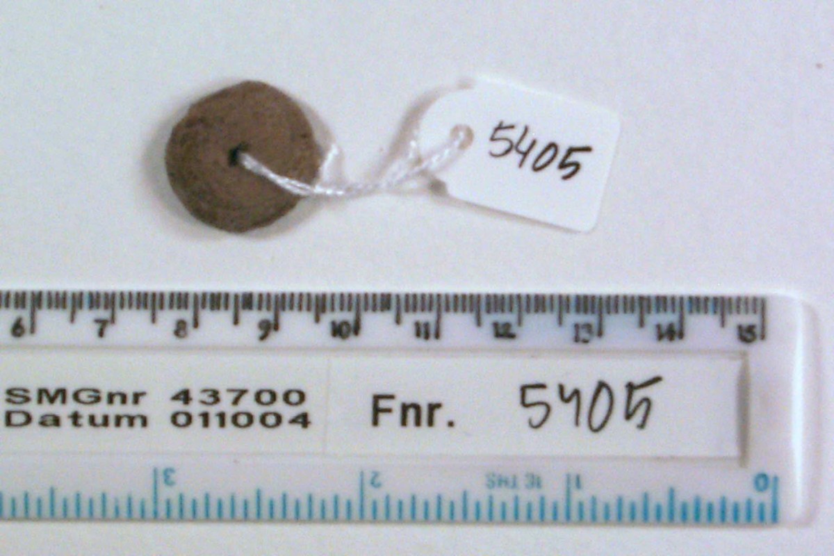 Knappform; cirkulär, lätt kullrig på ena sidan, flat på andra sidan, genomgående hål i mitten. Avtryck av runt föremål, form eller liknande på ovansidan. Tillverkad av lövträ.
