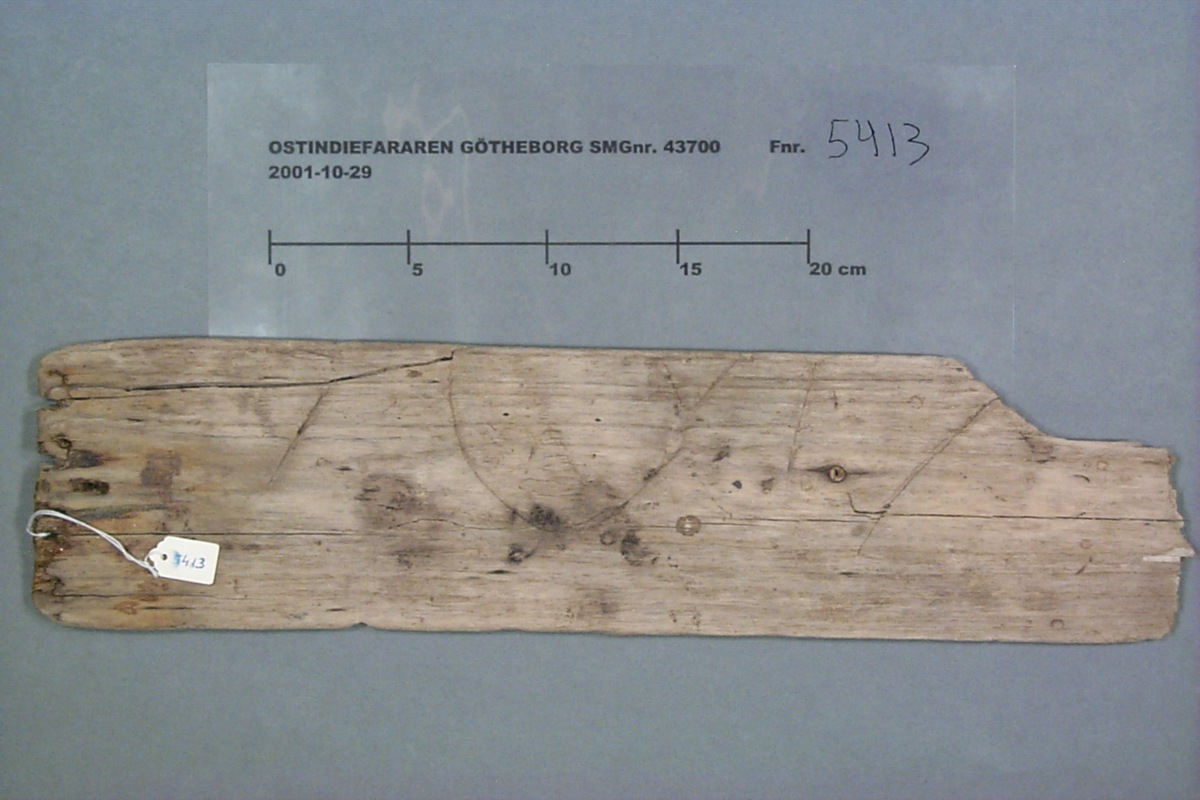 Föremålet är från vraket av ostindiefararen Götheborg, som gjorde tre resor till Kina 1739-45. Vid hemkomsten från den sista resan 12 september 1745 förliste fartyget vid grundet Hunnebådan strax utanför Nya Elfsborgs fästning. Vid flera tillfällen har material tagits upp från vraket. Föremålet kommer från de marinarkeologiska utgrävningarna på platsen 1986-1992.