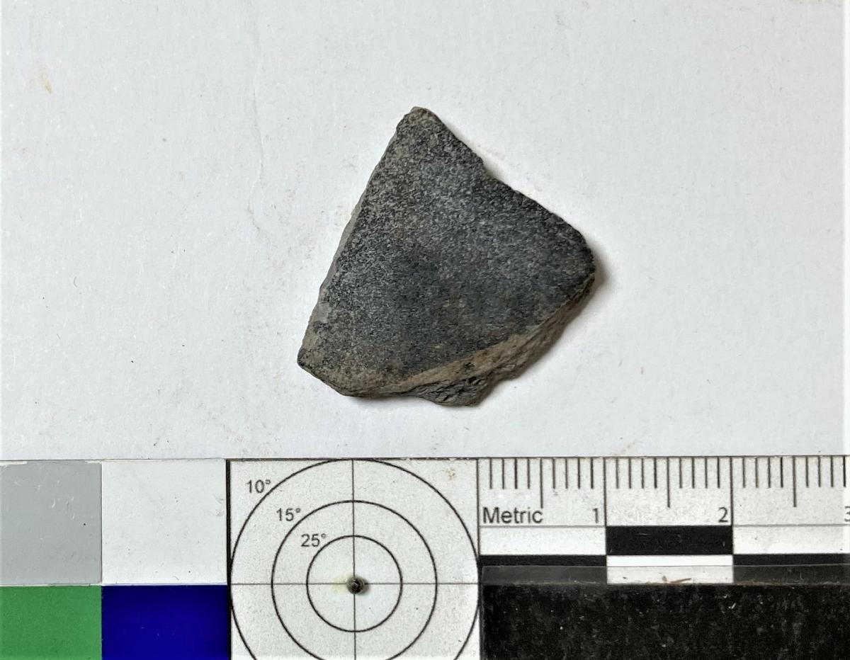skärva av kärl, lätt välvd. Grått gods, grå, oglaserad på insidan, mörkbrun glasyr på utsidan.
