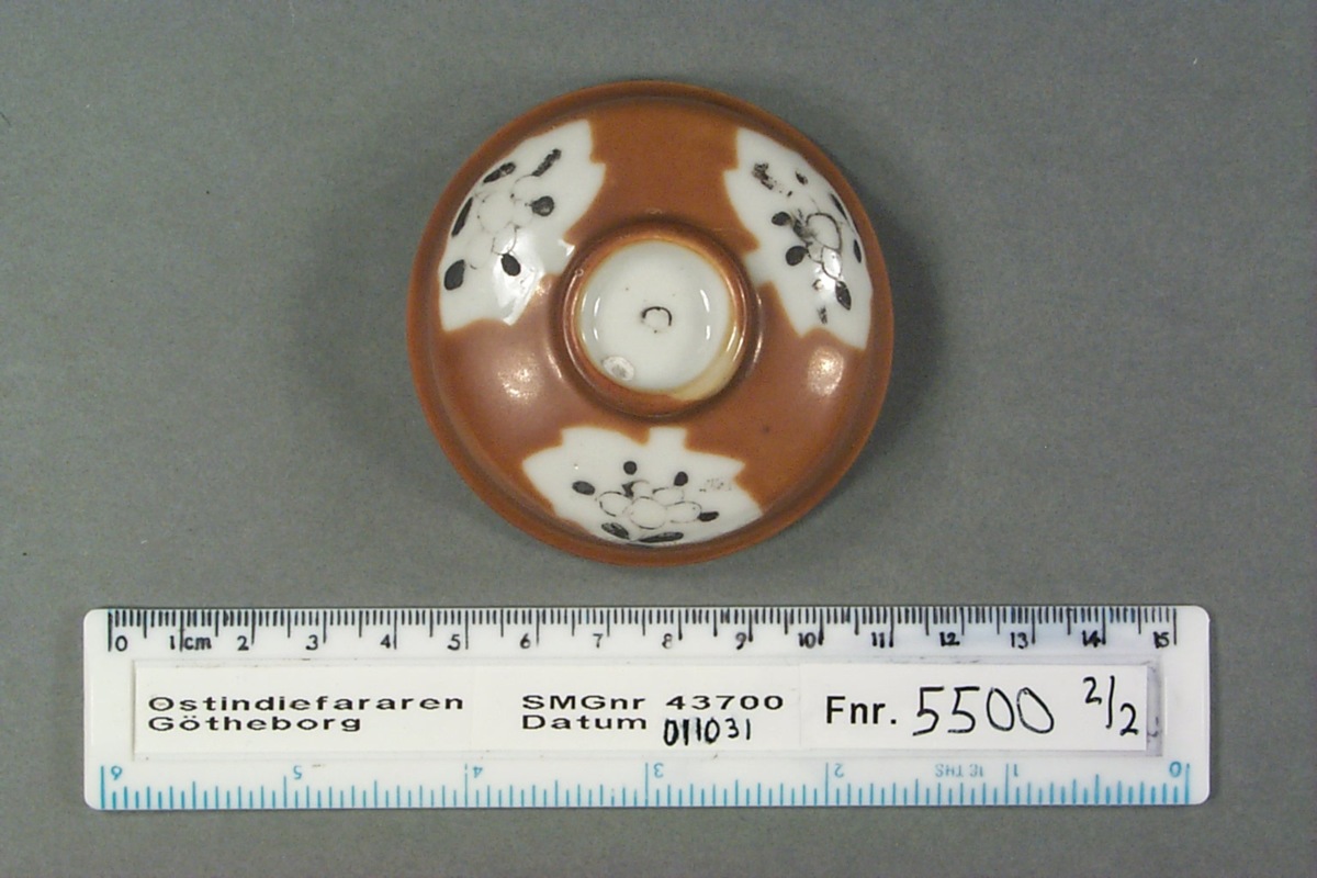 2) Lock till burk. Välvt med skålformat "handtag" i mitten på ovansidan, oglaserad kant, på undersidan, för passning i burken. Kategori D; brun glasyr med tre ursparningar i form av löv, som dekorerats med emaljfärger. Emaljfärgerna är lösa och känsliga och har mestadels fallit av, de som är kvar är svarta i färgen. D: 68 mm, H: 29 mm.