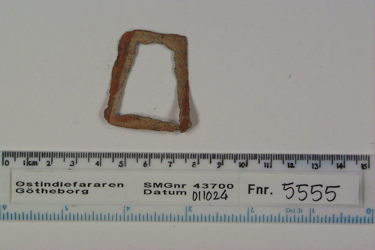 Trapetsformad metallbit, kanter runt om. Missfärgad av järnkorrosion.
