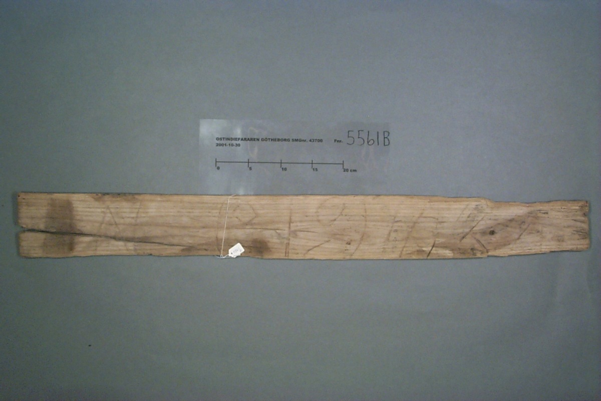Föremålet är från vraket av ostindiefararen Götheborg, som gjorde tre resor till Kina 1739-45. Vid hemkomsten från den sista resan 12 september 1745 förliste fartyget vid grundet Hunnebådan strax utanför Nya Elfsborgs fästning. Vid flera tillfällen har material tagits upp från vraket. Föremålet kommer från de marinarkeologiska utgrävningarna på platsen 1986-1992.