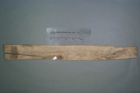 1) l: 890 mm, b: 97 mm, t: 10 mm. Eroderad i kanterna. Spikhål i kortkanterna, rester efter centrumtappar i långsidorna.
