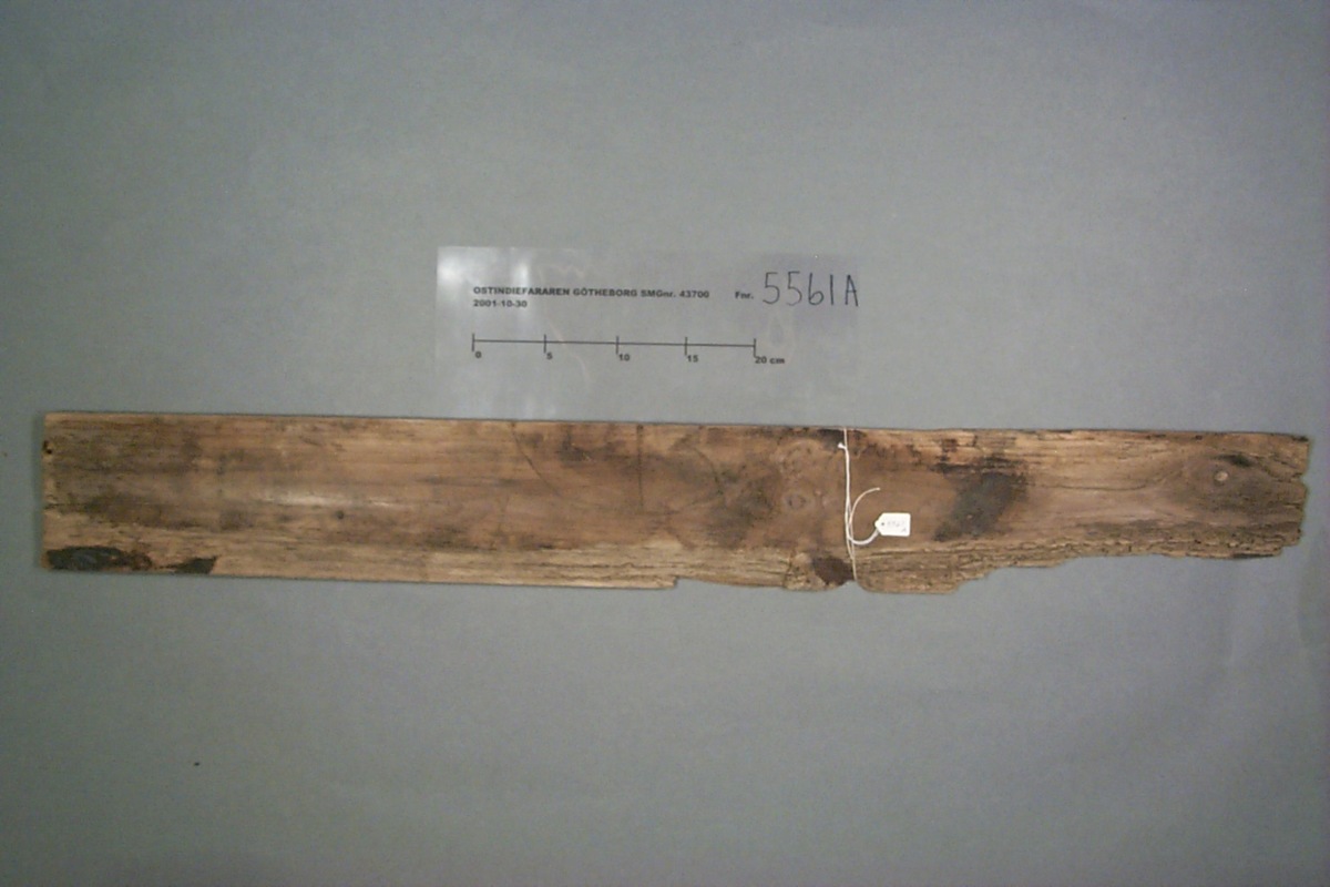 2) Mått enl. ovan. Avbruten i ena kortsidan. Spikhål i kortsidorna. Rester av centrumtappar i långsidorna. Rester av bemålning/ytbehandling, saltutfällningar på baksidan. Angripet av skeppsmask. Inskriptioner