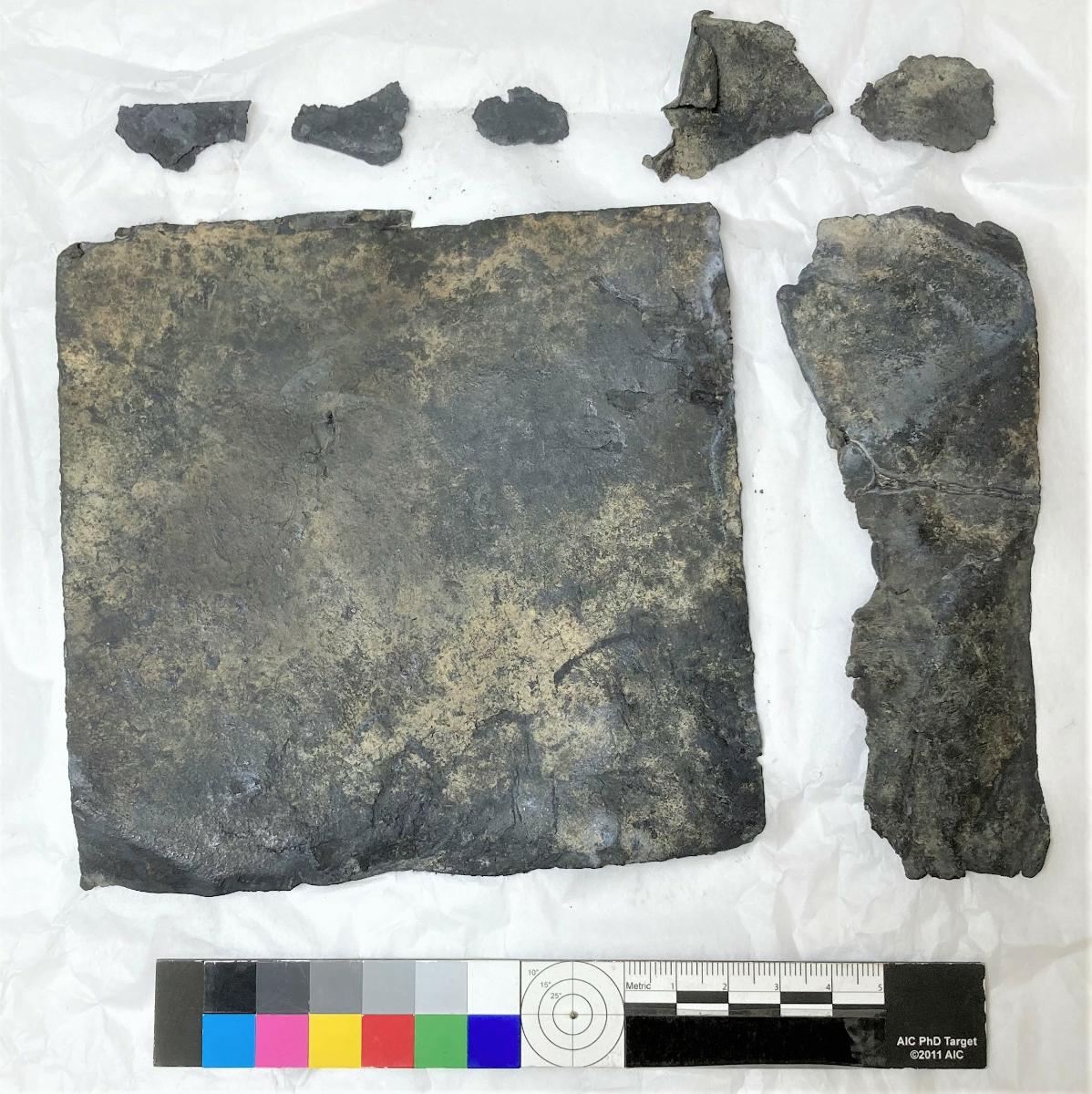 Blyplatta, kvadratisk. Ett antal mindre fragment av blyplattor.