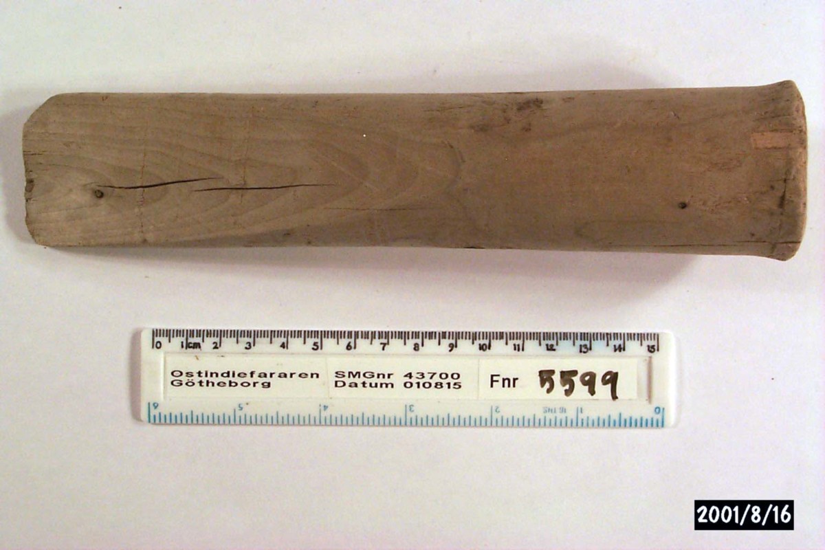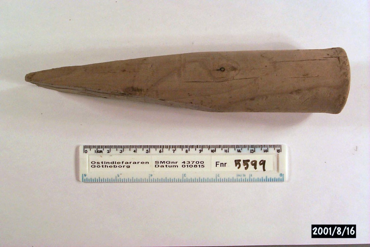 Föremålet är från vraket av ostindiefararen Götheborg, som gjorde tre resor till Kina 1739-45. Vid hemkomsten från den sista resan 12 september 1745 förliste fartyget vid grundet Hunnebådan strax utanför Nya Elfsborgs fästning. Vid flera tillfällen har material tagits upp från vraket. Föremålet kommer från de marinarkeologiska utgrävningarna på platsen 1986-1992.