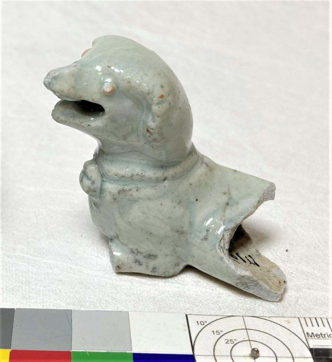 Hund i ljus turkosblå glasyr på ovansidan, oglaserad på undersidan, liggande med höger ben under kroppen, skarabé i ett band runt halsen. Framtassarna och bakkroppen avbrutna.