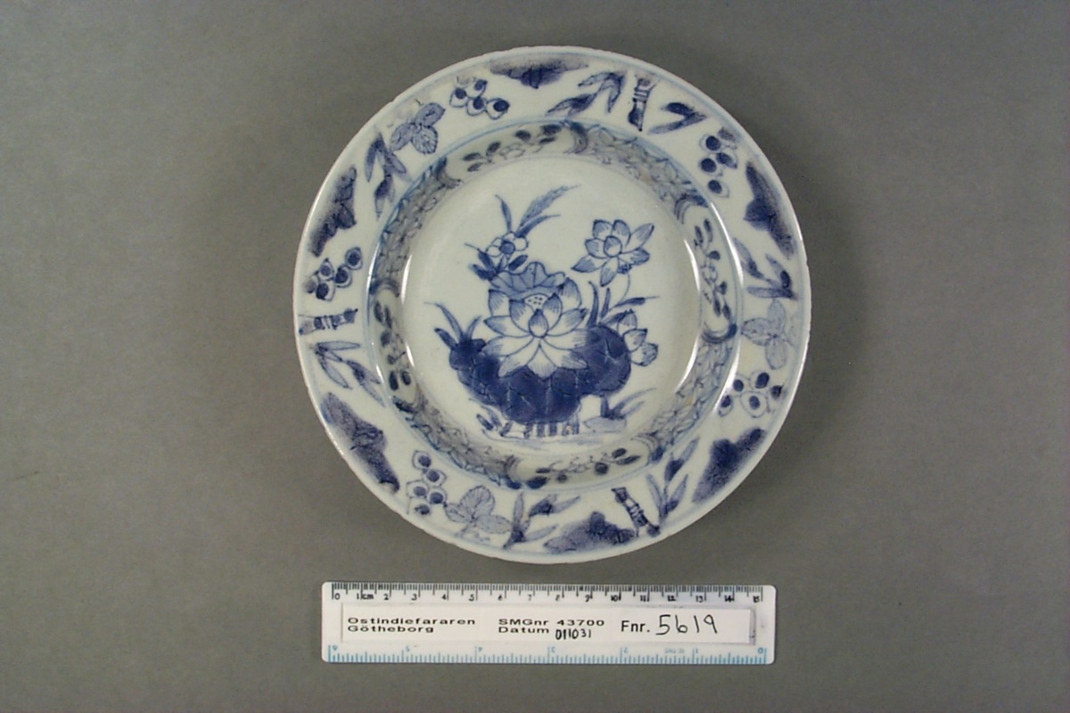 1) Skålrik. Kategori A; Underglasyrblå dekor; motiv: Mittmotivet lotusblommor, i kälningen en stjärnbård med blomreserver och runt brättet vindruvor och bambu. Kvistrankor på brättets baksida. Fina naggar i mynningskanten. Blek, suddig dekor. Lätt repad i botten.