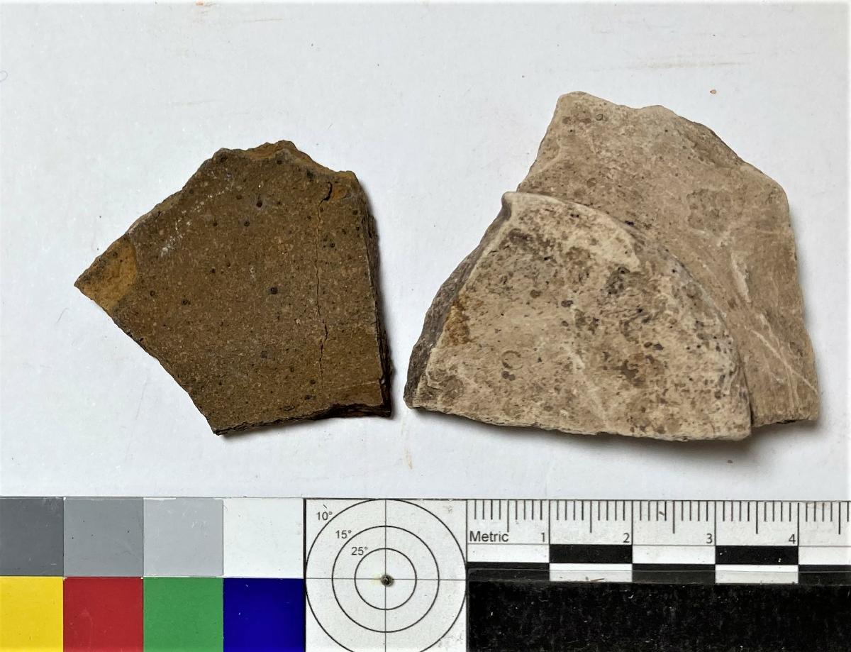 2) l: 37 mm, b: 35 mm, t: 6 mm. Beige gods, olivgrön glasyr på ena sidan.