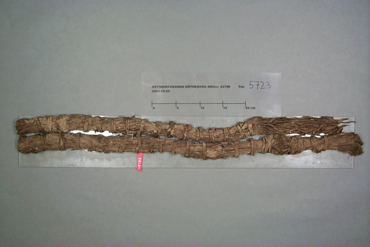 Föremålet är från vraket av ostindiefararen Götheborg, som gjorde tre resor till Kina 1739-45. Vid hemkomsten från den sista resan 12 september 1745 förliste fartyget vid grundet Hunnebådan strax utanför Nya Elfsborgs fästning. Vid flera tillfällen har material tagits upp från vraket. Föremålet kommer från de marinarkeologiska utgrävningarna på platsen 1986-1992.