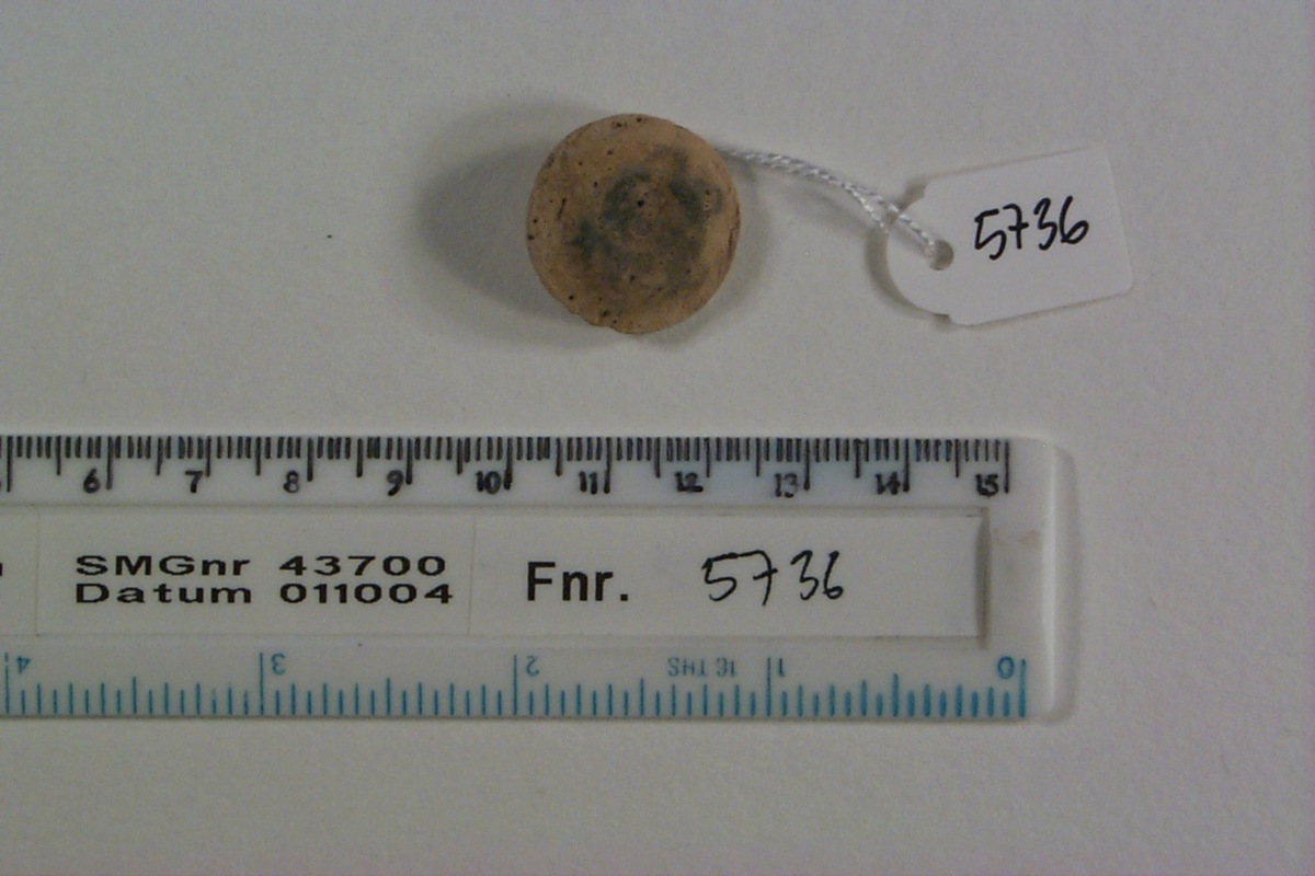 Undersydd knapp; svarvad med låg fot, 4 mm, genomgående hål för tråd/fästning, brätte svagt koniskt med kraterliknande fördjupning i mitten. Eroderad.