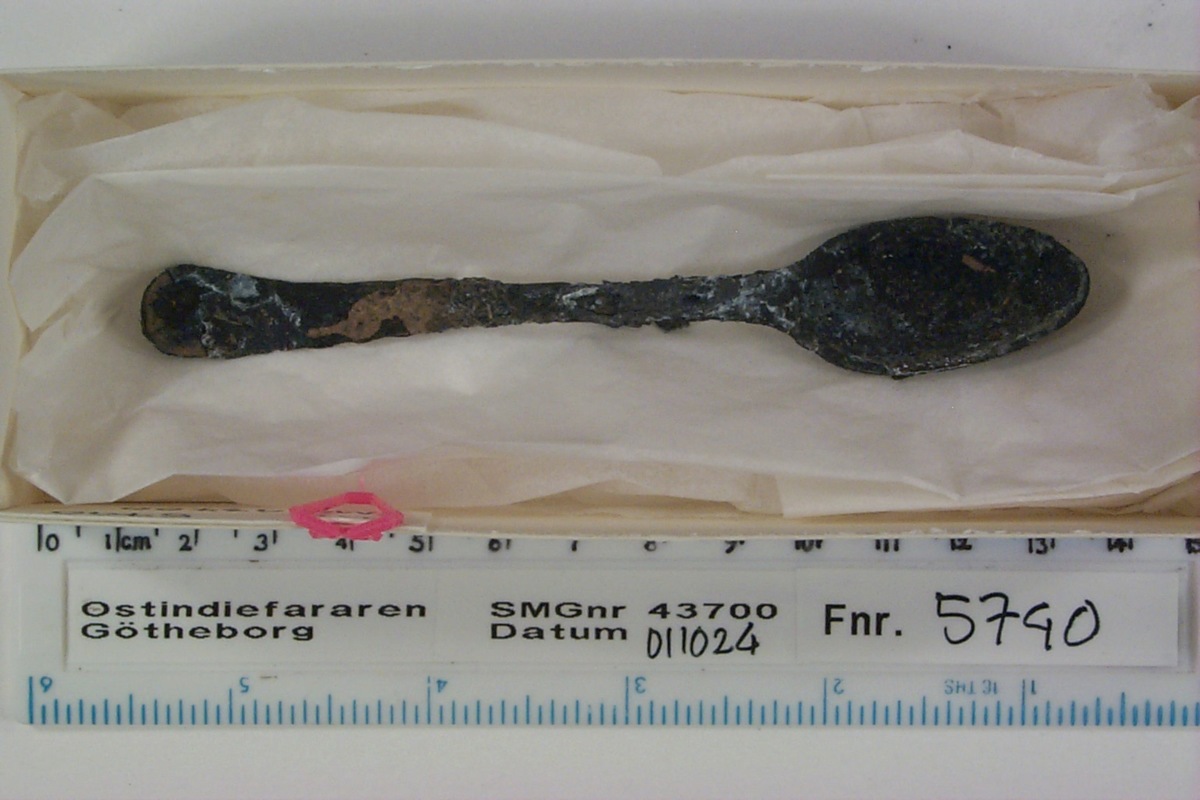 Föremålet är från vraket av ostindiefararen Götheborg, som gjorde tre resor till Kina 1739-45. Vid hemkomsten från den sista resan 12 september 1745 förliste fartyget vid grundet Hunnebådan strax utanför Nya Elfsborgs fästning. Vid flera tillfällen har material tagits upp från vraket. Föremålet kommer från de marinarkeologiska utgrävningarna på platsen 1986-1992.