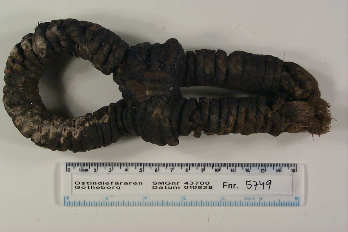 Föremålet är från vraket av ostindiefararen Götheborg, som gjorde tre resor till Kina 1739-45. Vid hemkomsten från den sista resan 12 september 1745 förliste fartyget vid grundet Hunnebådan strax utanför Nya Elfsborgs fästning. Vid flera tillfällen har material tagits upp från vraket. Föremålet kommer från de marinarkeologiska utgrävningarna på platsen 1986-1992.